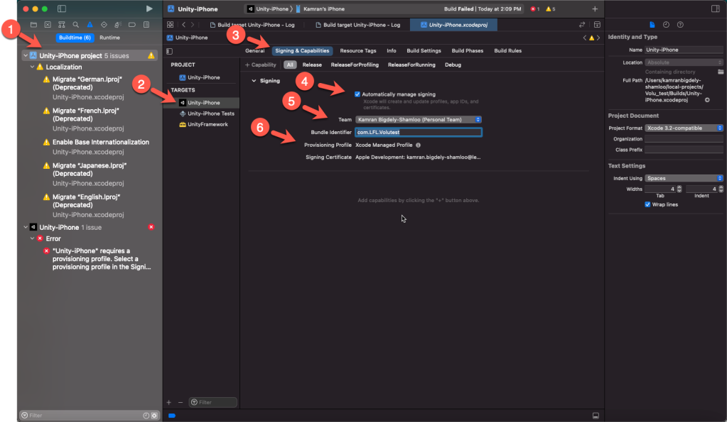 Code Signing Error: “Unity-iPhone” requires a provisioning profile. Select a provisioning profile for the “Release” build configuration in the project editor.