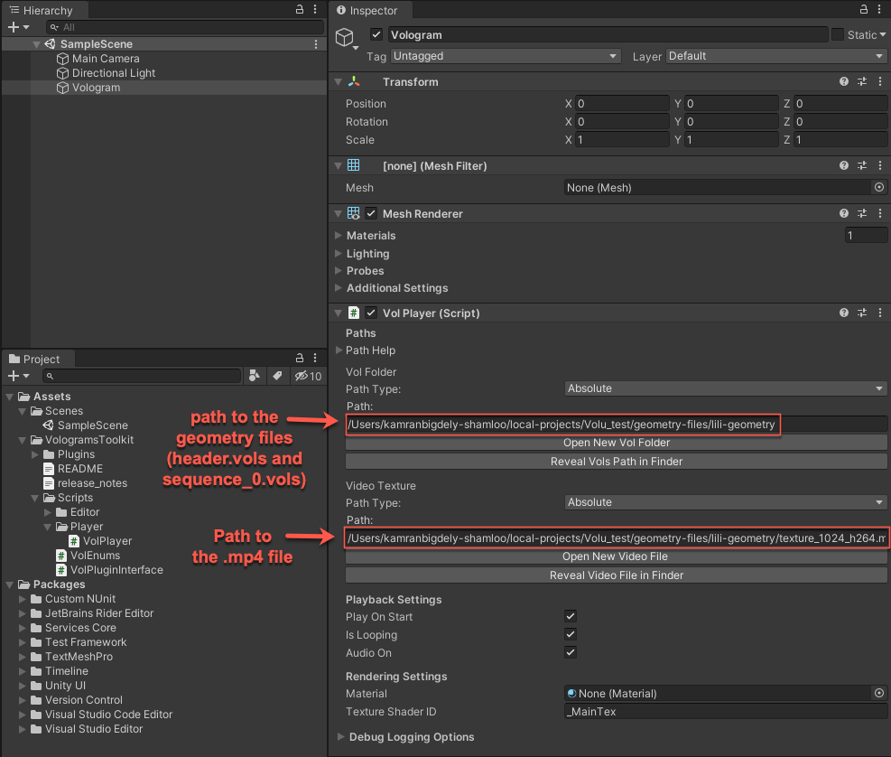 Create an empty GameObject. I called it ‘Vologram’. Attach the script “VolPlayer” to it. This script loads the geometry files and the related .mp4 file to play the video.